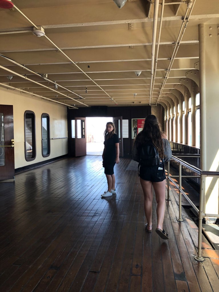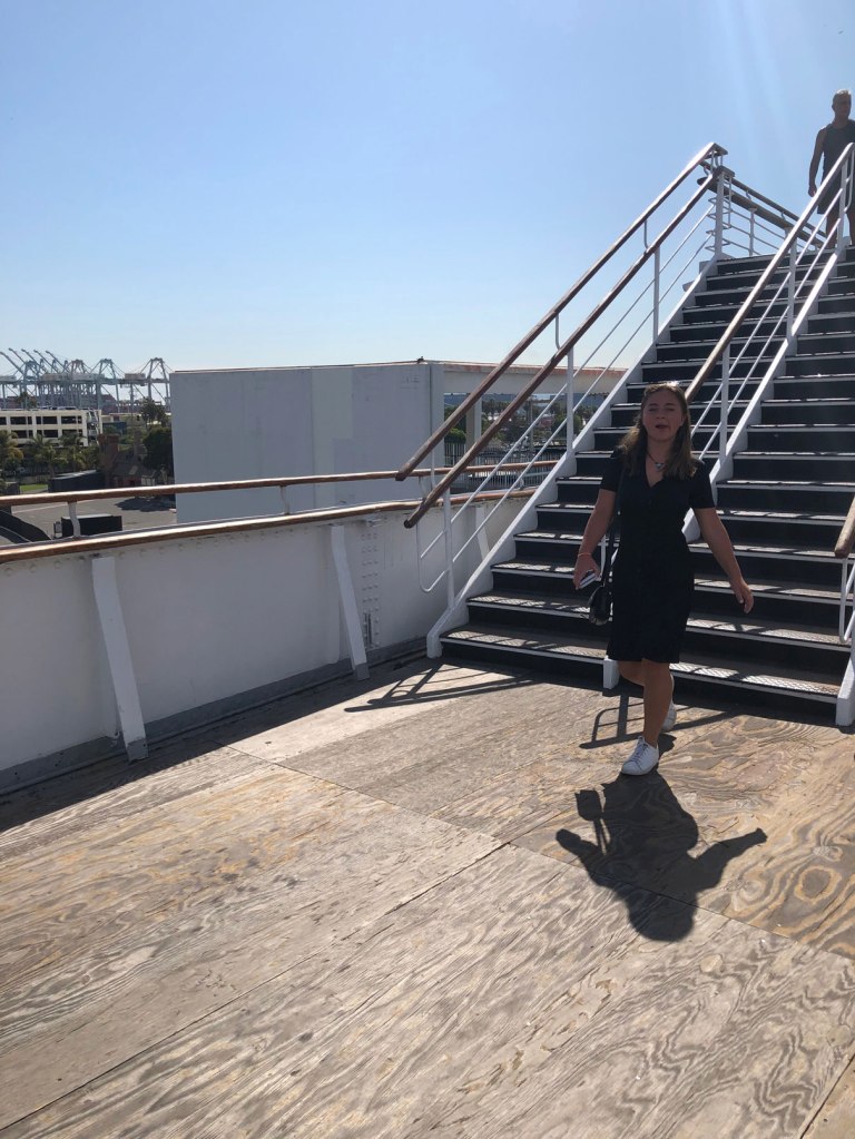 Hayley on the aft deck which is in need of new teak decking. The Queen Mary. Photo courtesy of Kris Core.