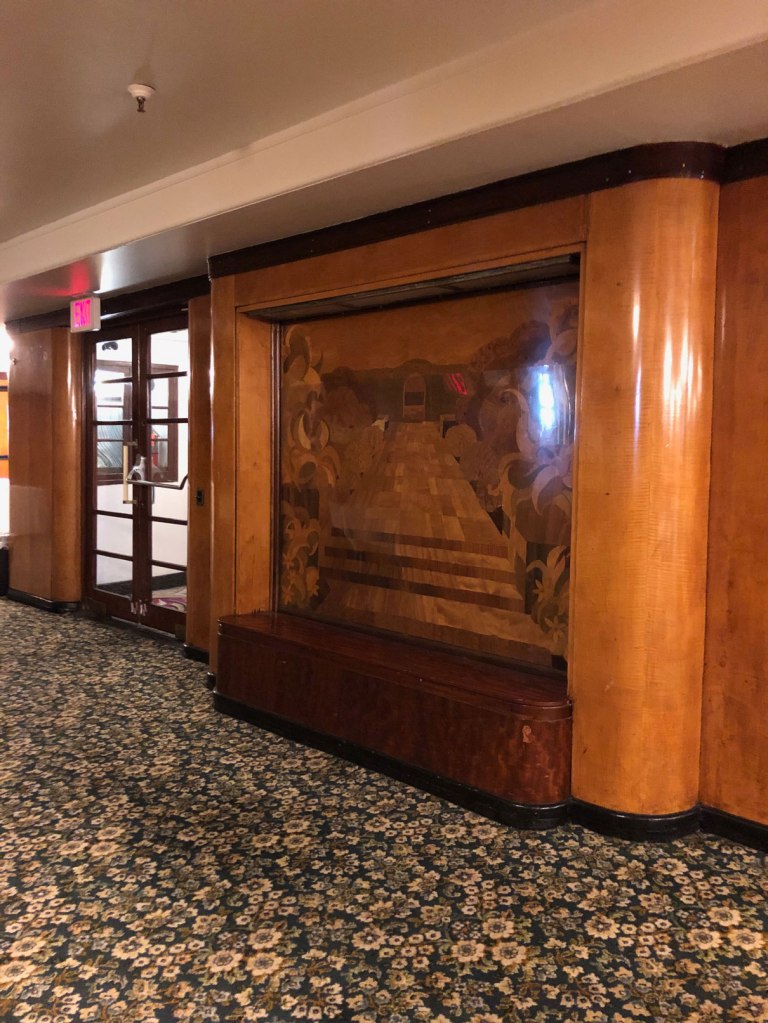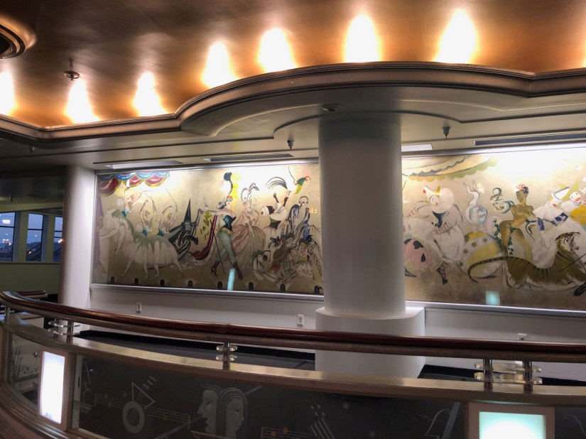 And everywhere you go, on every deck, you will see original features in the Art Deco style: lighting fixtures, wood paneling, railings, etched glass, molded metal door handles, all harkening back to the days when the cost of first class passage equaled the price of a new home. Many fixtures and displays have plaques (and sometimes photos showing original use), which are totally Instagram-worthy and totally worth searching out. In fact, probably THE MOST picture-posing 5-star spot on the ship has to be in the Verandah Grill where murals painted by Doris Zinkeisen are still displayed (the largest one, “Entertainment,” is featured below).